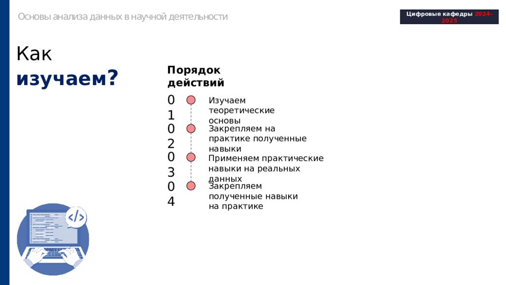 Основы анализа данных в научной деятельности Цифровые кафедры 2024-2025 Как изучаем ? Порядок действий Изучаем теоретические основы Закрепляем на практике полученные навыки Применяем практические навыки на реальных данных Закрепляем полученные навыки на практике 01 02 03 04