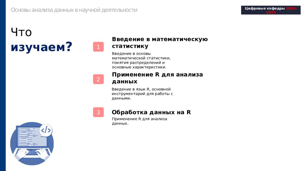 Основы анализа данных в научной деятельности Цифровые кафедры 2024-2025 Что изучаем ? 1 2 3 Введение в математическую статистику Введение в основы математической статистики, понятия распределений и основные характеристики. Применение R для анализа данных Введение в язык R, основной инструментарий для работы с данными. Обработка данных на R Применение R для анализа данных.