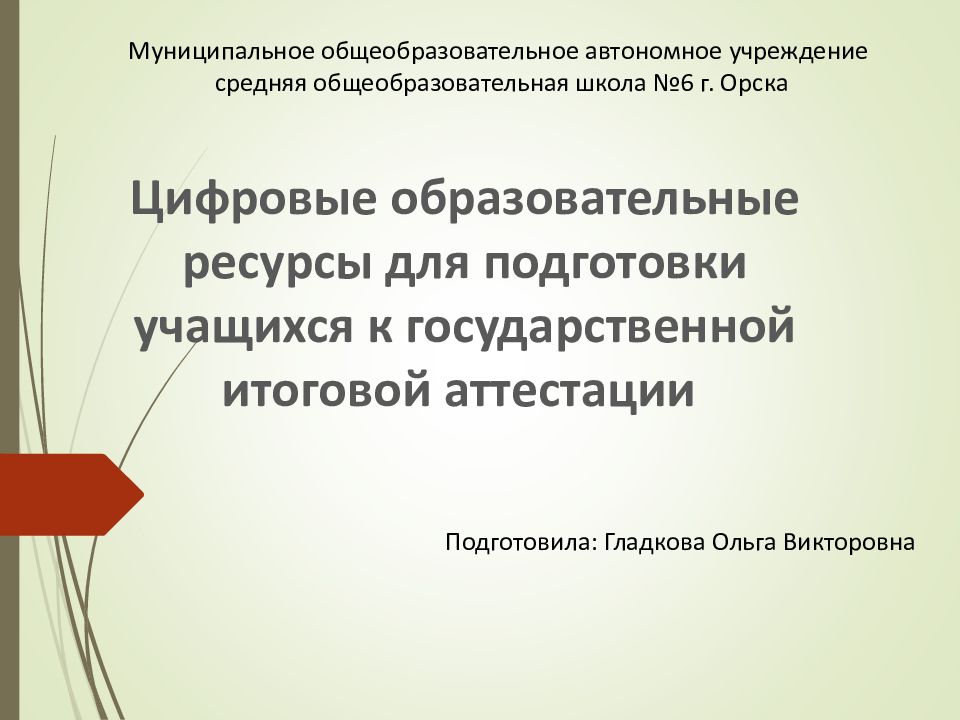 Цифровые образовательные ресурсы для подготовки учащихся к государственной итоговой аттестации Подготовила: Гладкова Ольга Викторовна Муниципальное общеобразовательное автономное учреждение средняя общеобразовательная школа №6 г. Орска