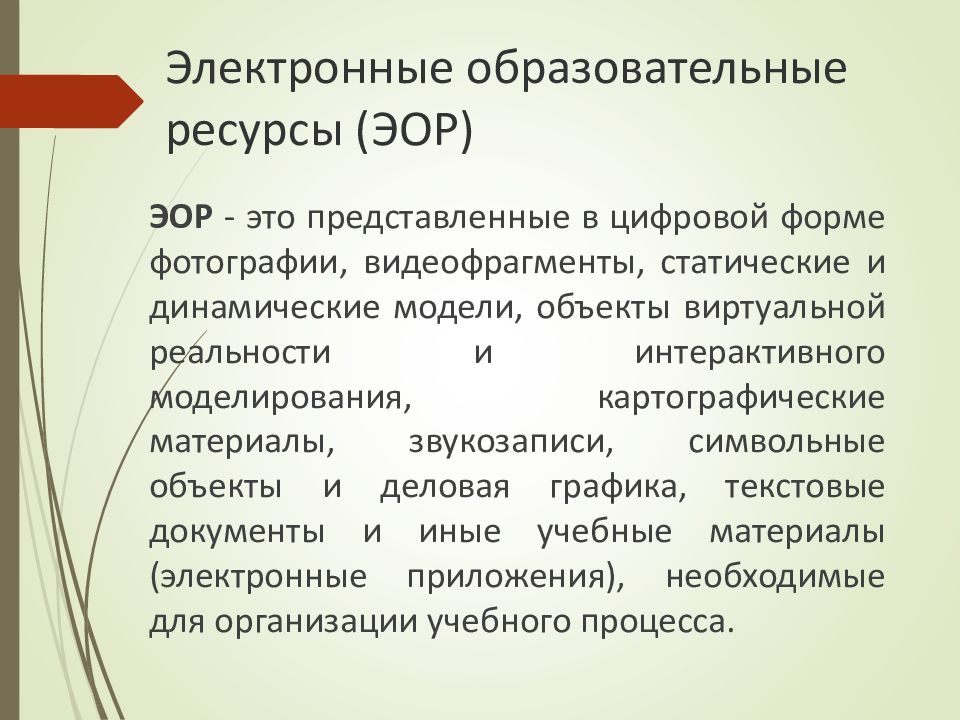 ЭОР - это представленные в цифровой форме фотографии, видеофрагменты, статические и динамические модели, объекты виртуальной реальности и интерактивного моделирования, картографические материалы, звукозаписи, символьные объекты и деловая графика, текстовые документы и иные учебные материалы (электронные приложения), необходимые для организации учебного процесса.