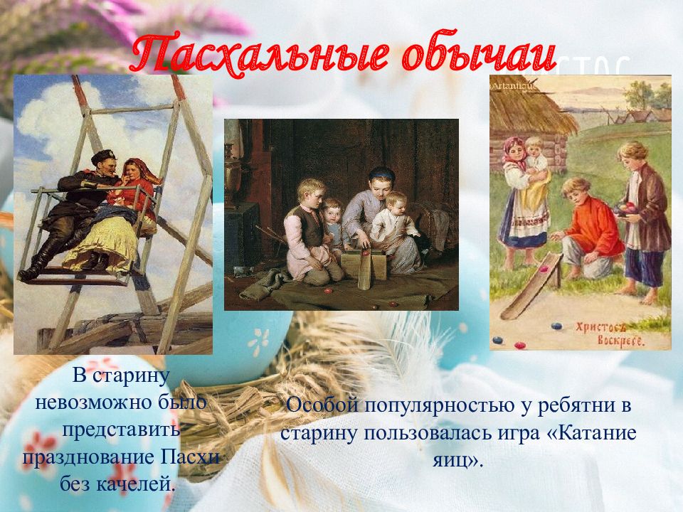 В старину невозможно было представить празднование Пасхи без качелей. Пасхальные обычаи Особой популярностью у ребятни в старину пользовалась игра «Катание яиц».
