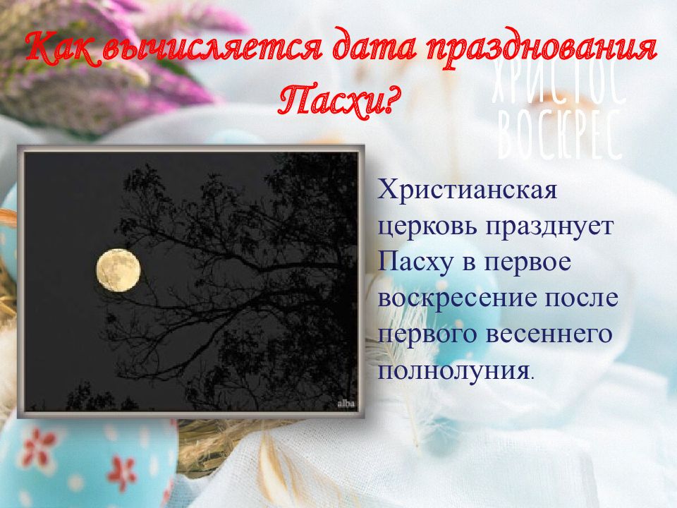 Христианская церковь празднует Пасху в первое воскресение после первого весеннего полнолуния.