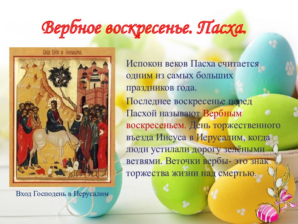 Испокон веков Пасха считается одним из самых больших праздников года. Последнее воскресенье перед Пасхой называют Вербным воскресеньем. День торжественного въезда Иисуса в Иерусалим, когда люди устилали дорогу зелёными ветвями. Веточки вербы- это знак торжества жизни над смертью. Вход Господень в Иерусалим