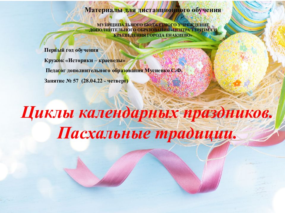 Материалы для дистанционного обучения МУНИЦИПАЛЬНОГО БЮДЖЕТНОГО УЧРЕЖДЕНИЕ ДОПОЛНИТЕЛЬНОГО ОБРАЗОВАНИЯ «ЦЕНТРА ТУРИЗМА И КРАЕВЕДЕНИЯ ГОРОДА ЕНАКИЕВО» Первый год обучения Кружок «Историки – краеведы» Педагог дополнительного образования Мусиенко С.Ф. Занятие № 57 ( 28.04.22 - четверг)