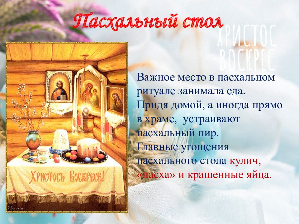 Пасхальный стол Важное место в пасхальном ритуале занимала еда. Придя домой, а иногда прямо в храме, устраивают пасхальный пир. Главные угощения пасхального стола кулич, «пасха» и крашенные яйца.