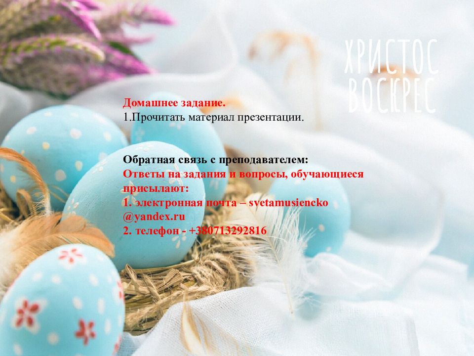 Домашнее задание. 1.Прочитать материал презентации. Обратная связь с преподавателем: Ответы на задания и вопросы, обучающиеся присылают: 1. электронная почта – svetamusiencko @ yandex. ru 2. телефон - +380713292816