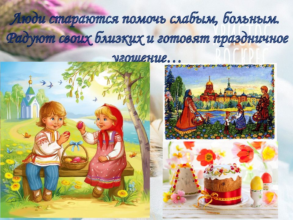 Слайд 21: Люди стараются помочь слабым, больным. Радуют своих близких и готовят праздничное угощение…