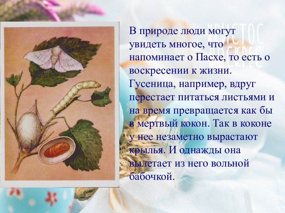 В природе люди могут увидеть многое, что напоминает о Пасхе, то есть о воскресении к жизни. Гусеница, например, вдруг перестает питаться листьями и на время превращается как бы в мертвый кокон. Так в коконе у нее незаметно вырастают крылья. И однажды она вылетает из него вольной бабочкой.