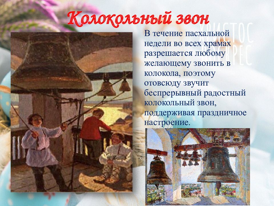 В течение пасхальной недели во всех храмах разрешается любому желающему звонить в колокола, поэтому отовсюду звучит беспрерывный радостный колокольный звон, поддерживая праздничное настроение. Колокольный звон