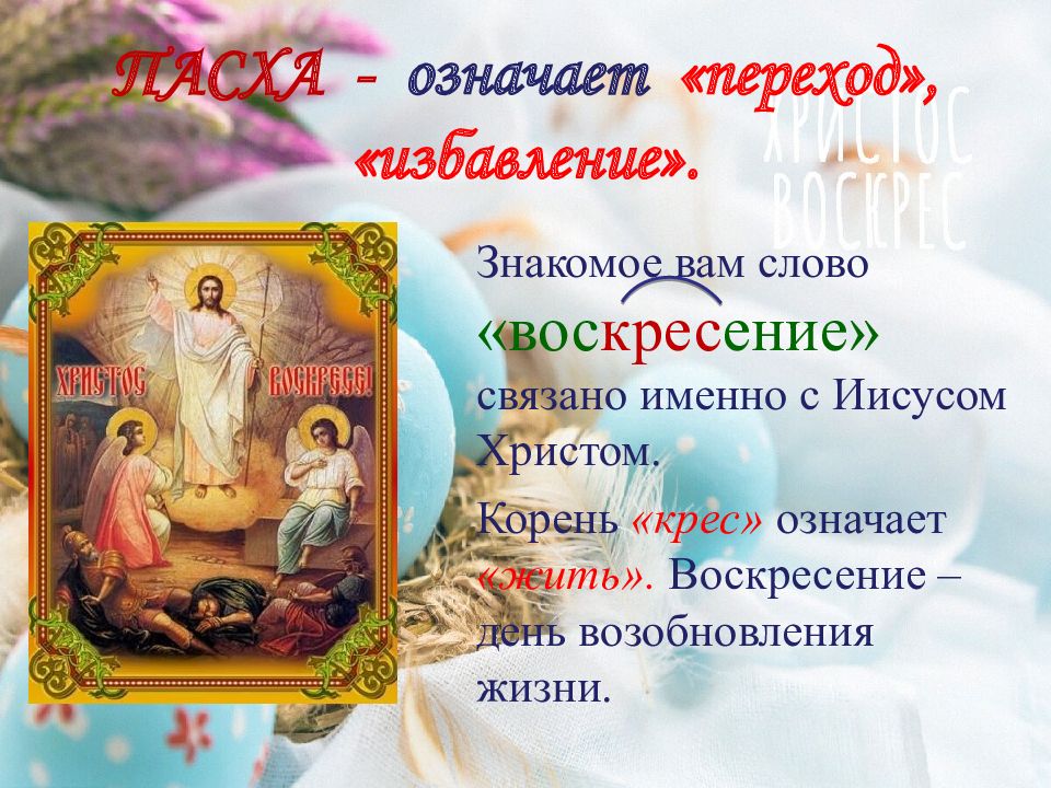 ПАСХА - означает «переход», «избавление». Знакомое вам слово «вос крес ение» связано именно с Иисусом Христом. Корень « крес » означает «жить». Воскресение – день возобновления жизни.