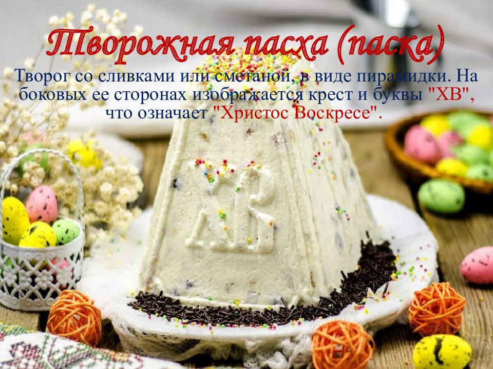 Творог со сливками или сметаной, в виде пирамидки. На боковых ее сторонах изображается крест и буквы "ХВ", что означает "Христос Воскресе ". Творожная пасха (паска)