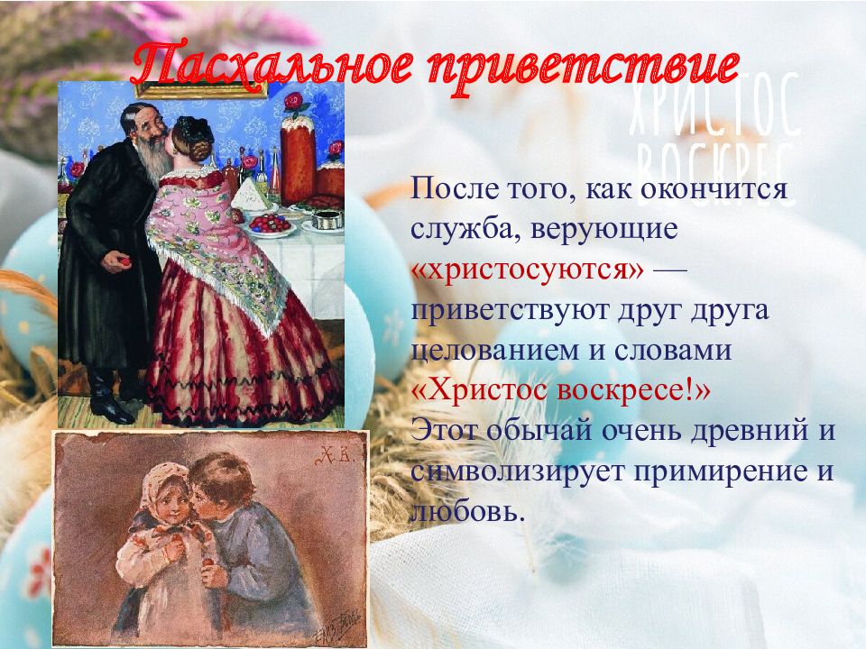 После того, как окончится служба, верующие «христосуются» — приветствуют друг друга целованием и словами «Христос воскресе!» Этот обычай очень древний и символизирует примирение и любовь. Пасхальное приветствие
