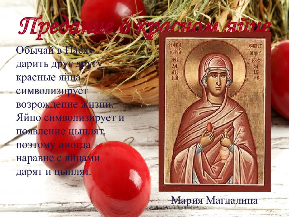 Предание о красном яйце Мария Магдалина Обычай в Пасху дарить друг другу красные яйца символизирует возрождение жизни. Яйцо символизирует и появление цыплят, поэтому иногда наравне с яйцами дарят и цыплят.