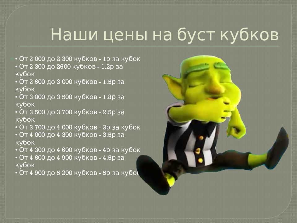 • От 2 000 до 2 300 кубков - 1р за кубок • От 2 300 до 2600 кубков - 1.2р за кубок • От 2 600 до 3 000 кубков - 1.5р за кубок • От 3 000 до 3 500 кубков - 1.8р за кубок • От 3 500 до 3 700 кубков - 2.5р за кубок • От 3 700 до 4 000 кубков - 3р за кубок • От 4 000 до 4 300 кубков - 3.5р за кубок • От 4 300 до 4 600 кубков - 4р за кубок • От 4 600 до 4 900 кубков - 4.5р за кубок • От 4 900 до 5 200 кубков - 5р за кубок