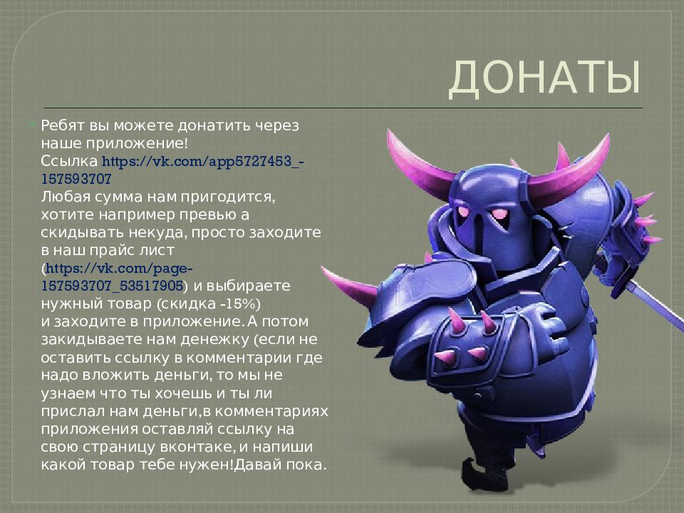Ребят вы можете донатить через наше приложение! Ссылка https://vk.com/app5727453_-157593707 Любая сумма нам пригодится, хотите например превью а скидывать некуда, просто заходите в наш прайс лист ( https://vk.com/page-157593707_53517905 ) и выбираете нужный товар (скидка -15%) и заходите в приложение. А потом закидываете нам денежку (если не оставить ссылку в комментарии где надо вложить деньги, то мы не узнаем что ты хочешь и ты ли прислал нам деньги,в комментариях приложения оставляй ссылку на свою страницу вконтаке, и напиши какой товар тебе нужен!Давай пока.