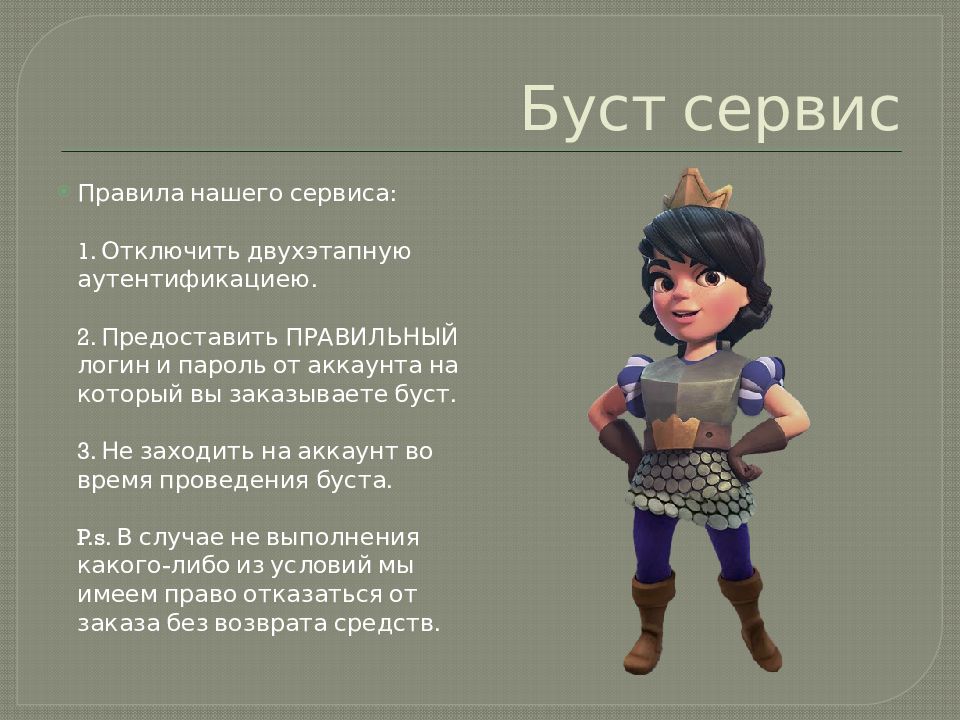 Правила нашего сервиса: 1. Отключить двухэтапную аутентификациею. 2. Предоставить ПРАВИЛЬНЫЙ логин и пароль от аккаунта на который вы заказываете буст. 3. Не заходить на аккаунт во время проведения буста. P.s. В случае не выполнения какого-либо из условий мы имеем право отказаться от заказа без возврата средств.