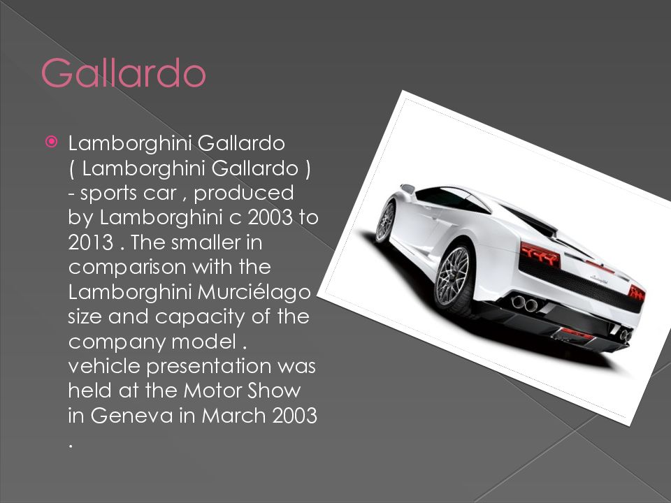 Lamborghini Gallardo ( Lamborghini Gallardo ) - sports car, produced by Lamborghini c 2003 to 2013. The smaller in comparison with the Lamborghini Murciélago size and capacity of the company model. vehicle presentation was held at the Motor Show in Geneva in March 2003.