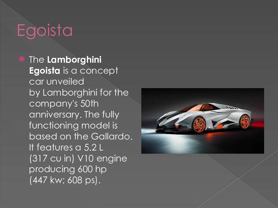 The Lamborghini Egoista is a concept car unveiled by Lamborghini for the company's 50th anniversary. The fully functioning model is based on the Gallardo. It features a 5.2 L (317 cu in) V10 engine producing 600 hp ( 447 kw ; 608 ps ).