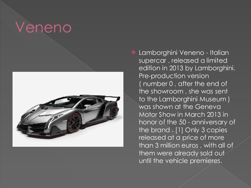 Lamborghini Veneno - Italian supercar, released a limited edition in 2013 by Lamborghini. Pre-production version ( number 0, after the end of the showroom, she was sent to the Lamborghini Museum ) was shown at the Geneva Motor Show in March 2013 in honor of the 50 - anniversary of the brand. [1] Only 3 copies released at a price of more than 3 million euros, with all of them were already sold out until the vehicle premieres.