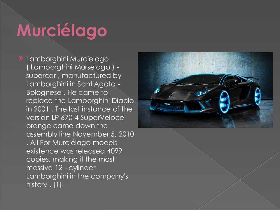 Lamborghini Murcielago ( Lamborghini Murselago ) - supercar, manufactured by Lamborghini in Sant'Agata - Bolognese. He came to replace the Lamborghini Diablo in 2001. The last instance of the version LP 670-4 SuperVeloce orange came down the assembly line November 5, 2010. All For Murciélago models existence was released 4099 copies, making it the most massive 12 - cylinder Lamborghini in the company's history. [1]