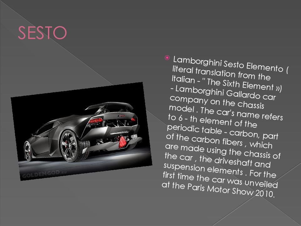 Lamborghini Sesto Elemento ( literal translation from the Italian - " The Sixth Element ») - Lamborghini Gallardo car company on the chassis model. The car's name refers to 6 - th element of the periodic table - carbon, part of the carbon fibers, which are made using the chassis of the car, the driveshaft and suspension elements. For the first time the car was unveiled at the Paris Motor Show 2010.