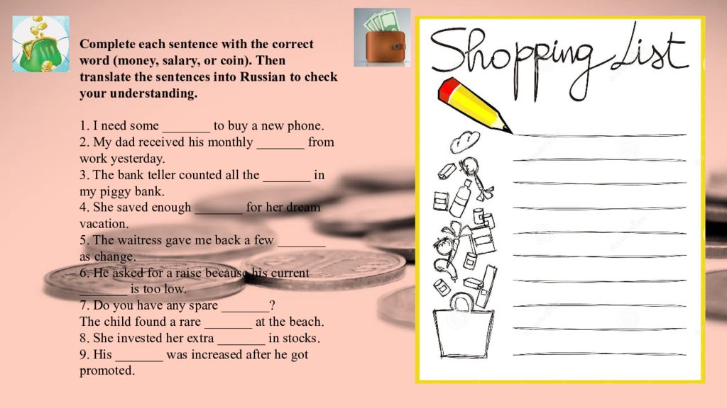 Complete each sentence with the correct word (money, salary, or coin). Then translate the sentences into Russian to check your understanding. 1. I need some _______ to buy a new phone. 2. My dad received his monthly _______ from work yesterday. 3. The bank teller counted all the _______ in my piggy bank. 4. She saved enough _______ for her dream vacation. 5. The waitress gave me back a few _______ as change. 6. He asked for a raise because his current _______ is too low. 7. Do you have any spare _______? The child found a rare _______ at the beach. 8. She invested her extra _______ in stocks. 9. His _______ was increased after he got promoted.