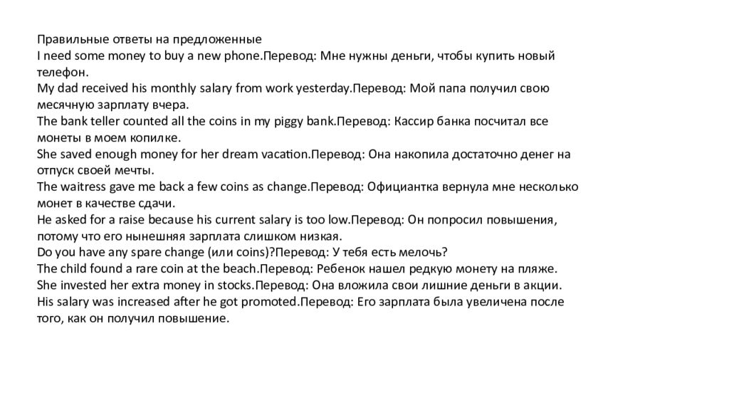 Правильные ответы на предложенные I need some money to buy a new phone. Перевод: Мне нужны деньги, чтобы купить новый телефон. My dad received his monthly salary from work yesterday. Перевод: Мой папа получил свою месячную зарплату вчера. The bank teller counted all the coins in my piggy bank. Перевод: Кассир банка посчитал все монеты в моем копилке. She saved enough money for her dream vacation. Перевод: Она накопила достаточно денег на отпуск своей мечты. The waitress gave me back a few coins as change. Перевод: Официантка вернула мне несколько монет в качестве сдачи. He asked for a raise because his current salary is too low. Перевод: Он попросил повышения, потому что его нынешняя зарплата слишком низкая. Do you have any spare change ( или coins)? Перевод: У тебя есть мелочь? The child found a rare coin at the beach. Перевод: Ребенок нашел редкую монету на пляже. She invested her extra money in stocks. Перевод: Она вложила свои лишние деньги в акции. His salary was increased after he got promoted. Перевод: Его зарплата была увеличена после того, как он получил повышение.