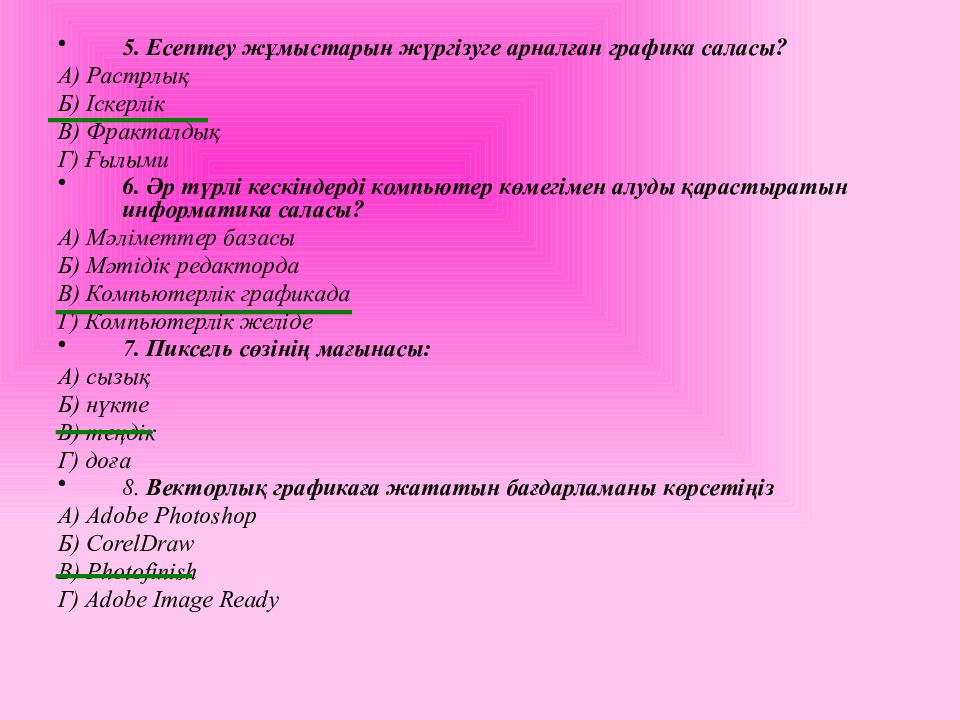 5. Есептеу жұмыстарын жүргізуге арналған графика саласы? A ) Растрлық Б) Іскерлік В) Фракталдық Г) Ғылыми 6. Әр түрлі кескіндерді компьютер көмегімен алуды қарастыратын информатика саласы? A ) Мәліметтер базасы Б) Мәтідік редакторда В) Компьютерлік графикада Г) Компьютерлік желіде 7. Пиксель сөзінің мағынасы: A) сызық Б) нүкте В) теңдік Г) доға 8. Векторлық графикаға жататын бағдарламаны көрсетіңіз A) Adobe Photoshop Б) CorelDraw В) Photofinish Г) Adobe Image Ready