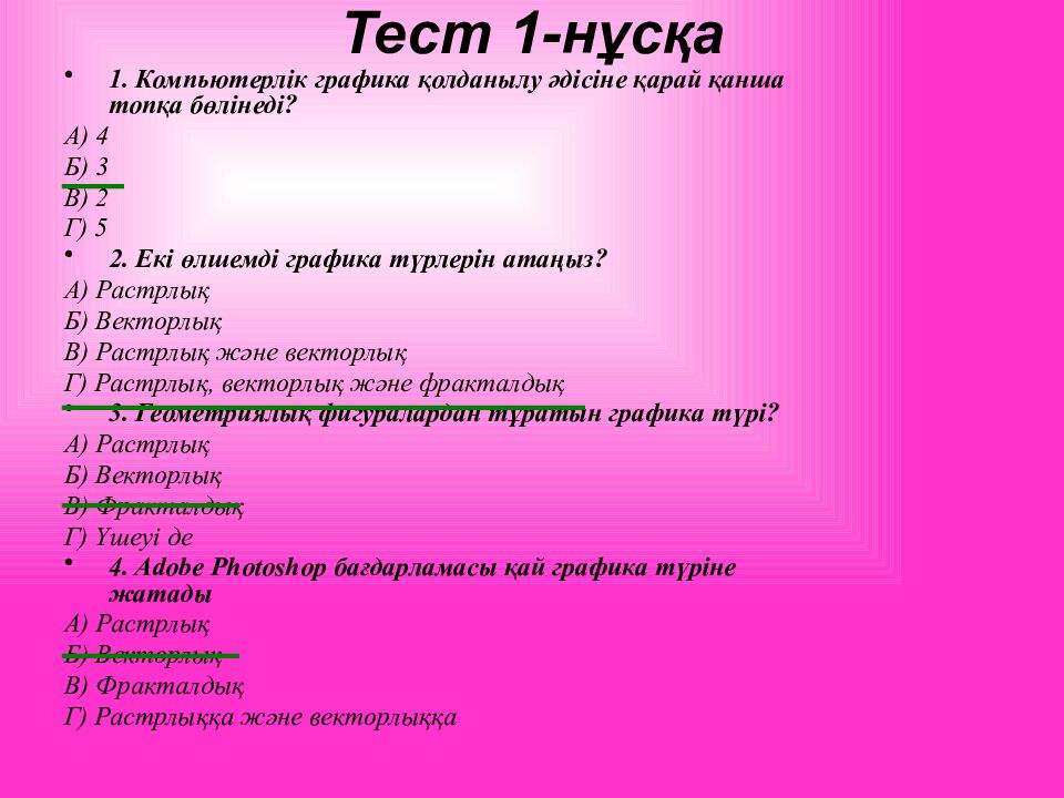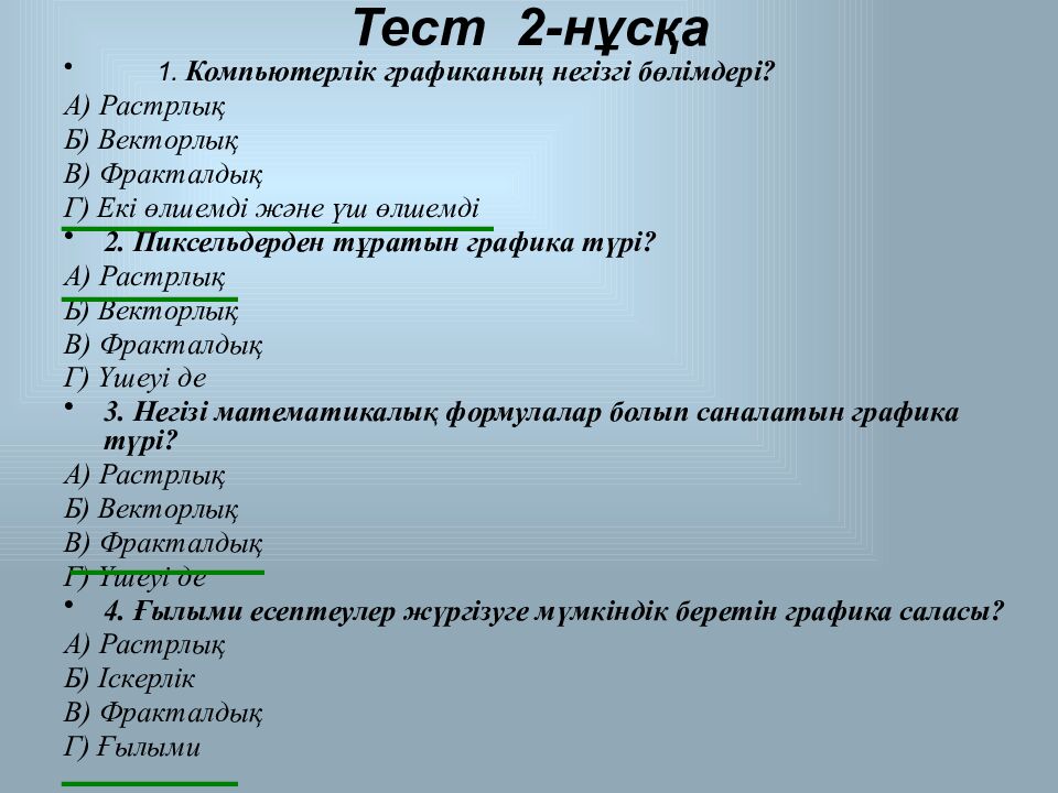 1. Компьютерлік графика қолданылу әдісіне қарай қанша топқа бөлінеді? A) 4 Б) 3 В) 2 Г) 5 2. Екі өлшемді графика түрлерін атаңыз? A ) Растрлық Б) Векторлық В) Растрлық және векторлық Г) Растрлық, векторлық және фракталдық 3. Геометриялық фигуралардан тұратын графика түрі? A ) Растрлық Б) Векторлық В) Фракталдық Г) Үшеуі де 4. Adobe Photoshop бағдарламасы қай графика түріне жатады A ) Растрлық Б) Векторлық В) Фракталдық Г) Растрлыққа және векторлыққа