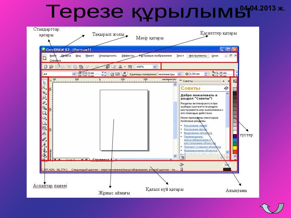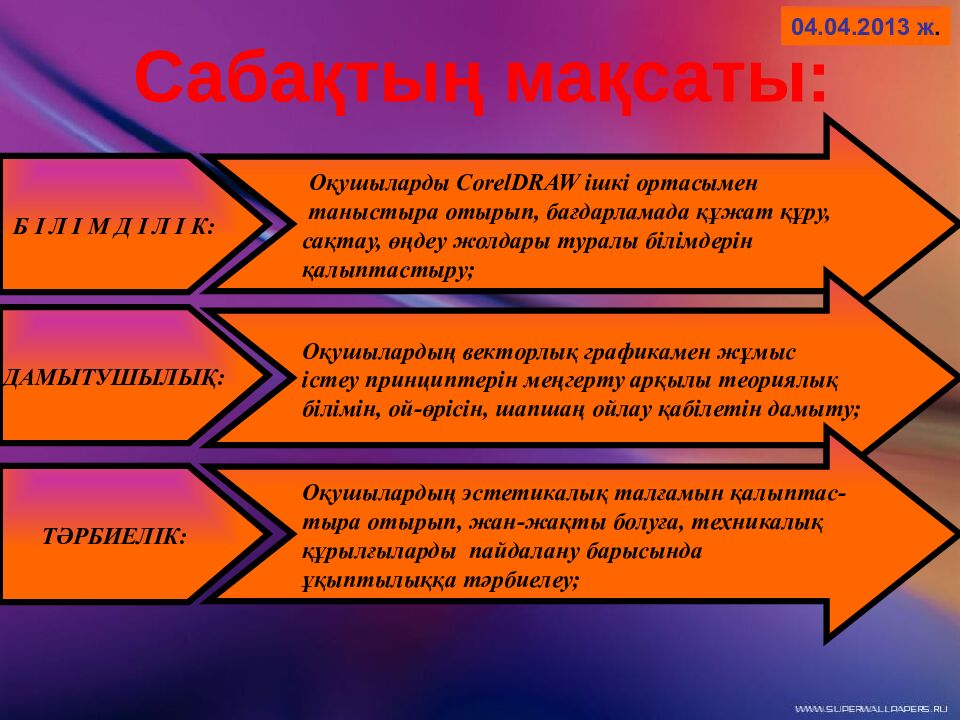 Сабақтың мақсаты: Б І Л І М Д І Л І К: Оқушыларды CorelDRAW ішкі ортасымен таныстыра отырып, бағдарламада құжат құру, сақтау, өңдеу жолдары туралы білімдерін қалыптастыру; ДАМЫТУШЫЛЫҚ: Оқушылардың векторлық графикамен жұмыс істеу принциптерін меңгерту арқылы теориялық білімін, ой-өрісін, шапшаң ойлау қабілетін дамыту; ТӘРБИЕЛІК: Оқушылардың эстетикалық талғамын қалыптас- тыра отырып, жан-жақты болуға, техникалық құрылғыларды пайдалану барысында ұқыптылыққа тәрбиелеу; 04.04.2013 ж.