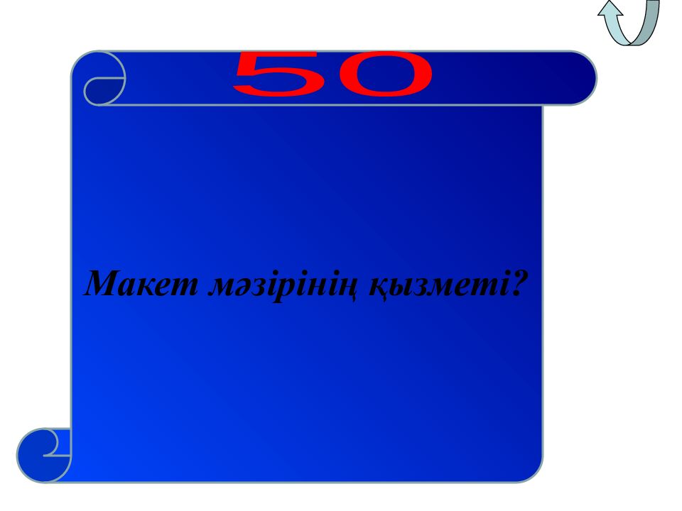 Жауабы: Парақ параметрлерін өзгертуге арналған. Макет мәзірінің қызметі? 50