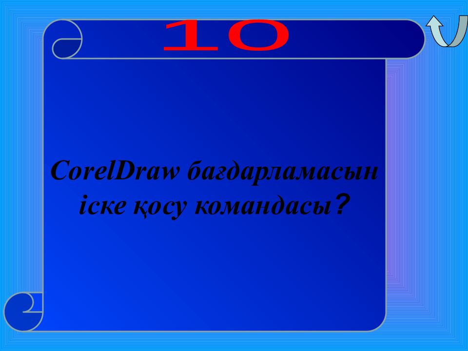 Жауабы : Пуск – Все программы – CorelDraw Suite X3 - CorelDraw X3 CorelDraw бағдарламасын іске қосу командасы ? 10