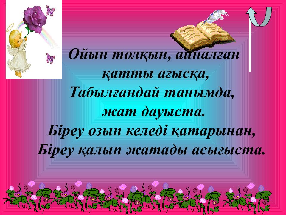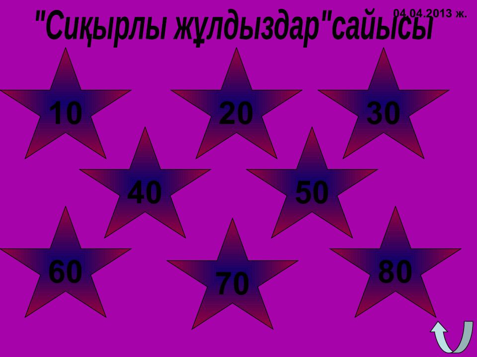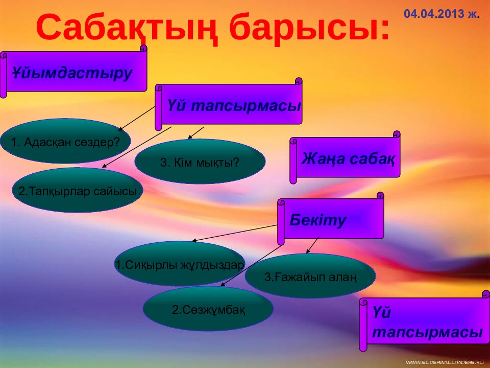 04.04.2013 ж. Сабақтың барысы: Ұйымдастыру Үй тапсырмасы Жаңа сабақ Бекіту 1. Адасқан сөздер? 2. Тапқырлар сайысы 3. Кім мықты? 1. Сиқырлы жұлдыздар 2.C өзжұмбақ 3. Ғажайып алаң Үй тапсырмасы