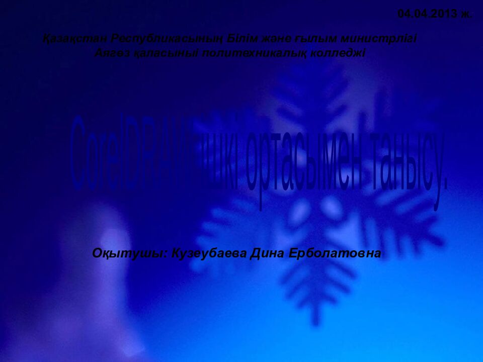 CorelDRAW ішкі ортасымен танысу. Қазақстан Республикасының Білім және ғылым министрлігі Аягөз қаласыныі политехникалық колледжі Оқытушы: Кузеубаева Дина Ерболатовна 0 4.04.2013 ж.