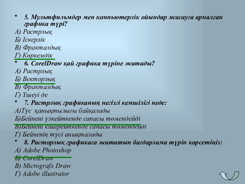 5. Мультфильмдер мен компьютерлік ойындар жасауға арналған графика түрі? A ) Растрлық Б) Іскерлік В) Фракталдық Г) Көркемдік 6. CorelDraw қай графика түріне жатады? A ) Растрлық Б) Векторлық В) Фракталдық Г) Үшеуі де 7. Растрлық графиканың негізгі кемшілігі неде: A)Түс қанықтылығы байқалады Б)Бейнені үлкейткенде сапасы төмендейді В)Бейнені кішірейткенде сапасы төмендейді Г) Бейненің түсі анықталады 8. Расторлық графикаға жататын бағдарлама түрін көрсетіңіз: A) Adobe Photoshop Б) CorelDraw В) Micrografx Draw Г) Adobe illustrator