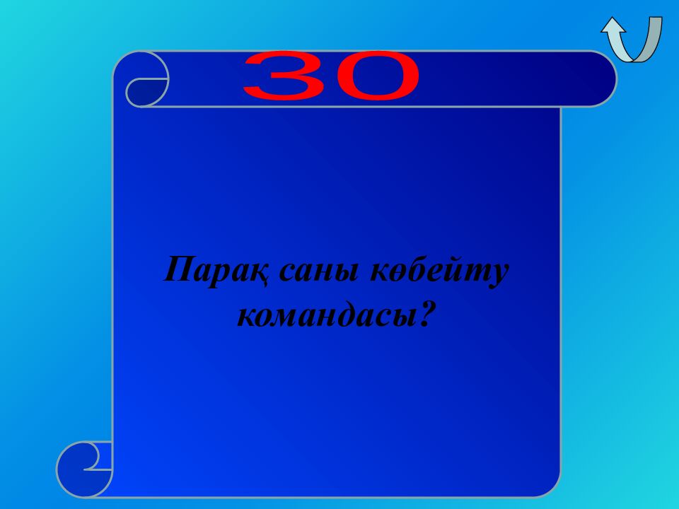 Жауабы: Парақтың санын (тышқанның оң жағын парақ атауында шертіп, Вставить страницу перед немесе после текущей ) Пара қ саны көбейту командасы? 30