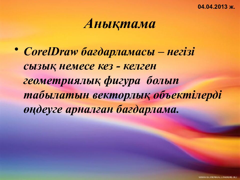 CorelDraw бағдарламасы – негізі сызық немесе кез - келген геометриялық фигура болып табылатын векторлық объектілерді өңдеуге арналған бағдарлама. 04.04.2013 ж.