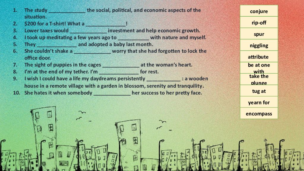 r ip-off spur niggling y earn for a ttribute b e at one with t ake the plunge t ug at encompass conjure The study _____________ the social, political, and economic aspects of the situation. $200 for a T-shirt! What a ______________! Lower taxes would _____________ investment and help economic growth. I took up meditating a few years ago to ___________ with nature and myself. They ______________ and adopted a baby last month. She couldn’t shake a _____________ worry that she had forgotten to lock the office door. The sight of puppies in the cages _____________ at the woman’s heart. I’m at the end of my tether. I’m ______________ for rest. I wish I could have a life my daydreams persistently ____________ : a wooden house in a remote village with a garden in blossom, serenity and tranquility. She hates it when somebody _____________ her success to her pretty face.