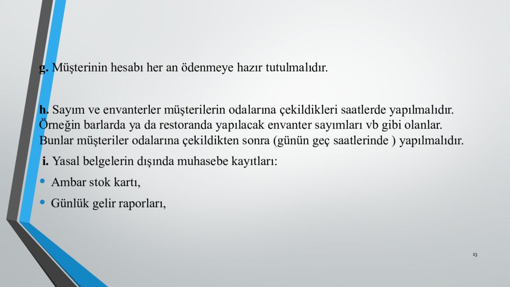g. Müşterinin hesabı her an ödenmeye hazır tutulmalıdır. h. Sayım ve envanterler müşterilerin odalarına çekildikleri saatlerde yapılmalıdır. Örneğin barlarda ya da restoranda yapılacak envanter sayımları vb gibi olanlar. Bunlar müşteriler odalarına çekildikten sonra (günün geç saatlerinde ) yapılmalıdır. i. Yasal belgelerin dışında muhasebe kayıtları : Ambar stok kartı, Günlük gelir raporları, 23
