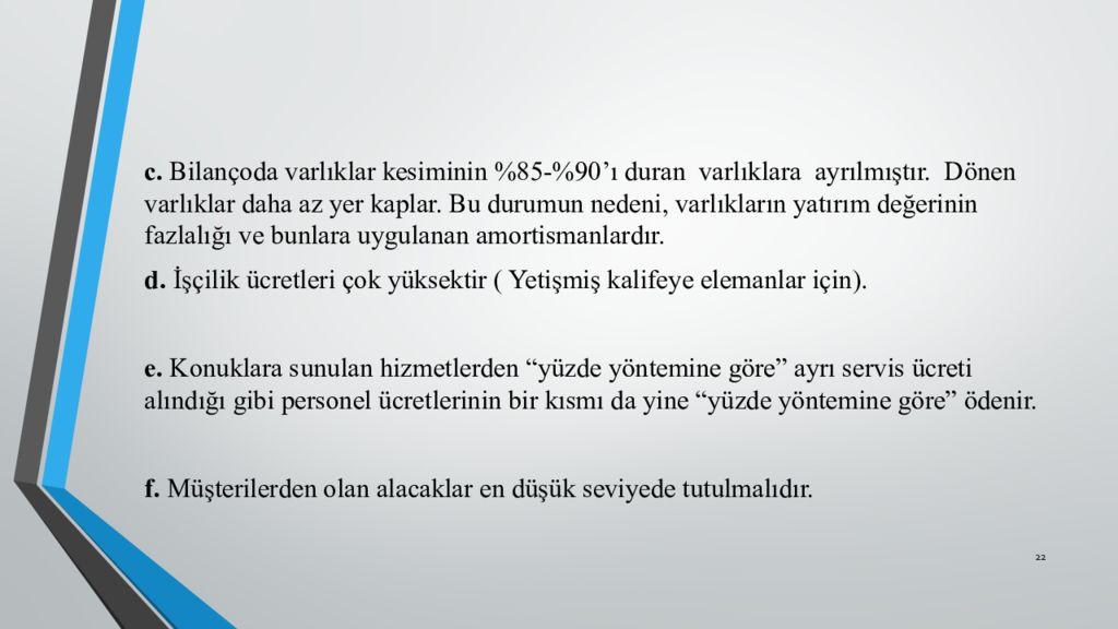 c. Bilançoda varlıklar kesiminin %85-%90’ı duran varlıklara ayrılmıştır. Dönen varlıklar daha az yer kaplar. Bu durumun nedeni, varlıkların yatırım değerinin fazlalığı ve bunlara uygulanan amortismanlardır. d. İşçilik ücretleri çok yüksektir ( Yetişmiş kalifeye elemanlar için ). e. Konuklara sunulan hizmetlerden “ yüzde yöntemine göre ” ayrı servis ücreti alındığı gibi personel ücretlerinin bir kısmı da yine “ yüzde yöntemine göre ” ödenir. f. Müşterilerden olan alacaklar en düşük seviyede tutulmalıdır. 22