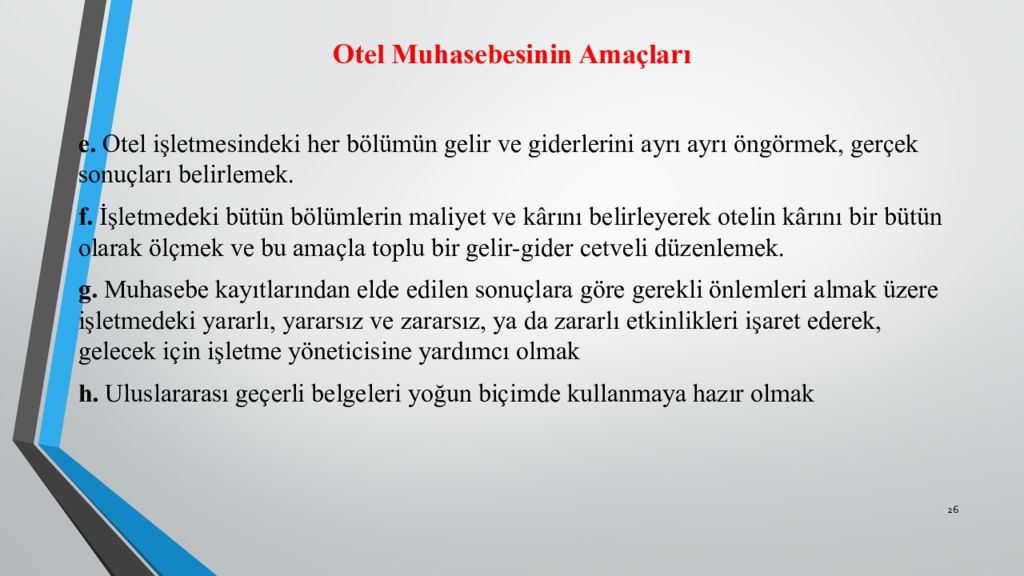 e. Otel işletmesindeki her bölümün gelir ve giderlerini ayrı ayrı öngörmek, gerçek sonuçları belirlemek. f. İşletmedeki bütün bölümlerin maliyet ve kârını belirleyerek otelin kârını bir bütün olarak ölçmek ve bu amaçla toplu bir gelir-gider cetveli düzenlemek. g. Muhasebe kayıtlarından elde edilen sonuçlara göre gerekli önlemleri almak üzere işletmedeki yararlı, yararsız ve zararsız, ya da zararlı etkinlikleri işaret ederek, gelecek için işletme yöneticisine yardımcı olmak h. Uluslararası geçerli belgeleri yoğun biçimde kullanmaya hazır olmak 26