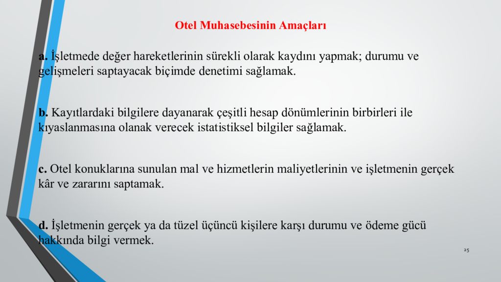 a. İşletmede değer hareketlerinin sürekli olarak kaydını yapmak; durumu ve gelişmeleri saptayacak biçimde denetimi sağlamak. b. Kayıtlardaki bilgilere dayanarak çeşitli hesap dönümlerinin birbirleri ile kıyaslanmasına olanak verecek istatistiksel bilgiler sağlamak. c. Otel konuklarına sunulan mal ve hizmetlerin maliyetlerinin ve işletmenin gerçek kâr ve zararını saptamak. d. İşletmenin gerçek ya da tüzel üçüncü kişilere karşı durumu ve ödeme gücü hakkında bilgi vermek. 25