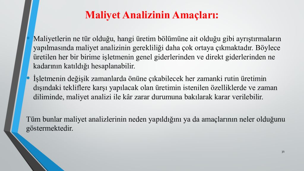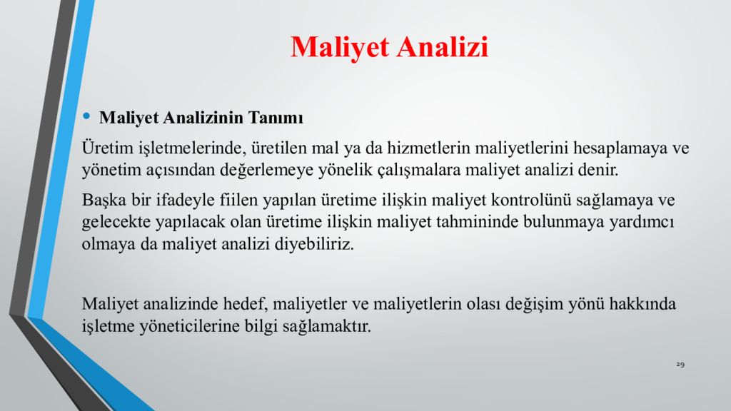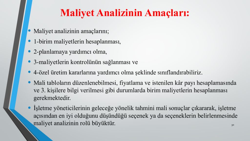Maliyet Analizinin Tanımı Üretim işletmelerinde, üretilen mal ya da hizmetlerin maliyetlerini hesaplamaya ve yönetim açısından değerlemeye yönelik çalışmalara maliyet analizi denir. Başka bir ifadeyle fiilen yapılan üretime ilişkin maliyet kontrolünü sağlamaya ve gelecekte yapılacak olan üretime ilişkin maliyet tahmininde bulunmaya yardımcı olmaya da maliyet analizi diyebiliriz. Maliyet analizinde hedef, maliyetler ve maliyetlerin olası değişim yönü hakkında işletme yöneticilerine bilgi sağlamaktır. 29