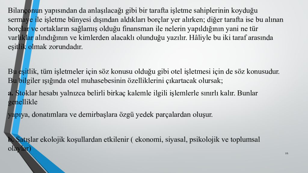 Bilançonun yapısından da anlaşılacağı gibi bir tarafta işletme sahiplerinin koyduğu sermaye ile işletme bünyesi dışından aldıkları borçlar yer alırken ; diğer tarafta ise bu alınan borçlar ve ortakların sağlamış olduğu finansman ile nelerin yapıldığının yani ne tür varlıklar alındığının ve kimlerden alacaklı olunduğu yazılır. Hâliyle bu iki taraf arasında eşitlik olmak zorundadır. Bu eşitlik, tüm işletmeler için söz konusu olduğu gibi otel işletmesi için de söz konusudur. Bu bilgiler ışığında otel muhasebesinin özelliklerini çıkartacak olursak ; a. Stoklar hesabı yalnızca belirli birkaç kalemle ilgili işlemlerle sınırlı kalır. Bunlar genellikle yapıya, donatımlara ve demirbaşlara özgü yedek parçalardan oluşur. b. Satışlar ekolojik koşullardan etkilenir ( ekonomi, siyasal, psikolojik ve toplumsal olaylar ) 21