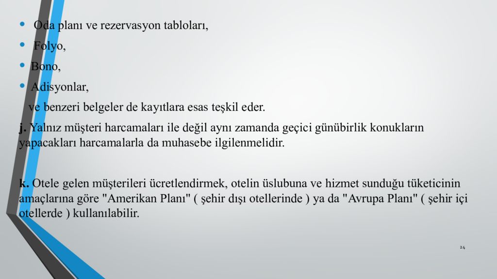 Oda planı ve rezervasyon tabloları, Folyo, Bono, Adisyonlar, ve benzeri belgeler de kayıtlara esas teşkil eder. j. Yalnız müşteri harcamaları ile değil aynı zamanda geçici günübirlik konukların yapacakları harcamalarla da muhasebe ilgilenmelidir. k. Otele gelen müşterileri ücretlendirmek, otelin üslubuna ve hizmet sunduğu tüketicinin amaçlarına göre " Amerikan Planı " ( şehir dışı otellerinde ) ya da " Avrupa Planı " ( şehir içi otellerde ) kullanılabilir. 24