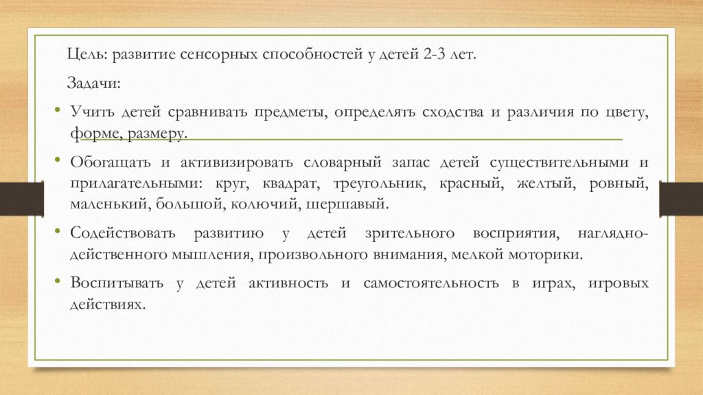 Цель : развитие сенсорных способностей у детей 2-3 лет. Задачи: Учить детей сравнивать предметы, определять сходства и различия по цвету, форме, размеру. Обогащать и активизировать словарный запас детей существительными и прилагательными: круг, квадрат, треугольник, красный, желтый, ровный, маленький, большой, колючий, шершавый. Содействовать развитию у детей зрительного восприятия, наглядно-действенного мышления, произвольного внимания, мелкой моторики. Воспитывать у детей активность и самостоятельность в играх, игровых действиях.
