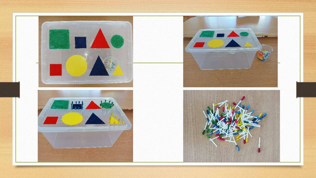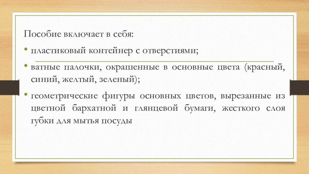 Пособие включает в себя: пластиковый контейнер с отверстиями; ватные палочки, окрашенные в основные цвета (красный, синий, желтый, зеленый); геометрические фигуры основных цветов, вырезанные из цветной бархатной и глянцевой бумаги, жесткого слоя губки для мытья посуды
