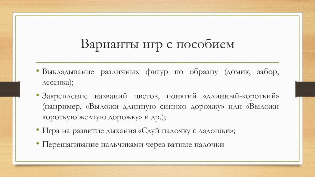 Выкладывание различных фигур по образцу (домик, забор, лесенка); Закрепление названий цветов, понятий «длинный-короткий» (например, «Выложи длинную синюю дорожку» или «Выложи короткую желтую дорожку» и др.); Игра на развитие дыхания «Сдуй палочку с ладошки»; Перешагивание пальчиками через ватные палочки
