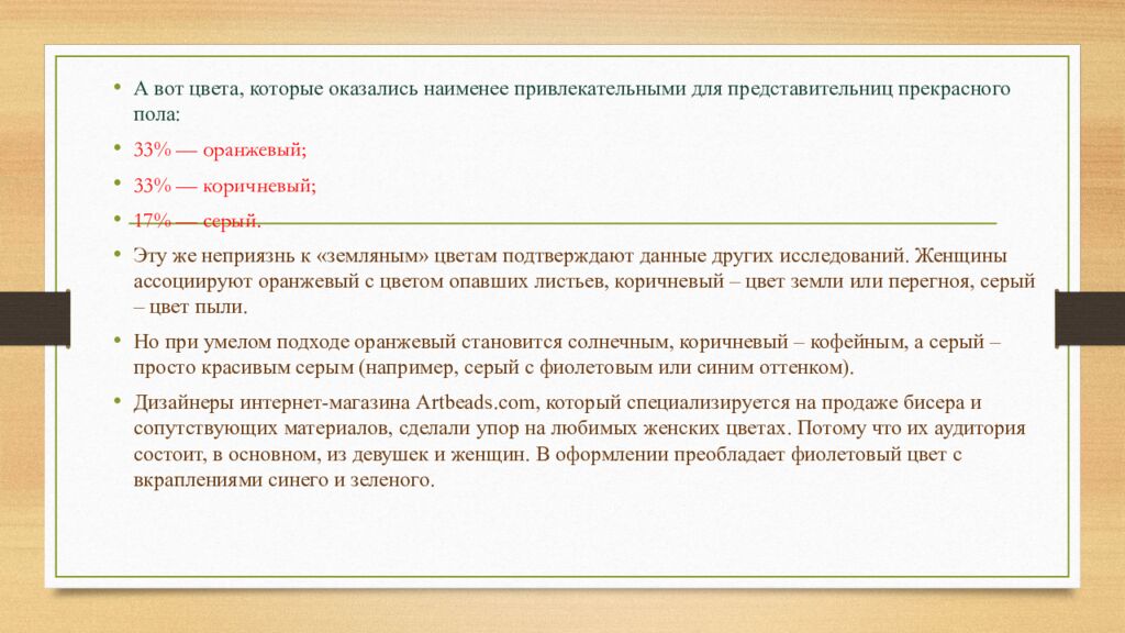 А вот цвета, которые оказались наименее привлекательными для представительниц прекрасного пола: 33% — оранжевый; 33% — коричневый; 17% — серый. Эту же неприязнь к «земляным» цветам подтверждают данные других исследований. Женщины ассоциируют оранжевый с цветом опавших листьев, коричневый – цвет земли или перегноя, серый – цвет пыли. Но при умелом подходе оранжевый становится солнечным, коричневый – кофейным, а серый – просто красивым серым (например, серый с фиолетовым или синим оттенком). Дизайнеры интернет-магазина Artbeads.com, который специализируется на продаже бисера и сопутствующих материалов, сделали упор на любимых женских цветах. Потому что их аудитория состоит, в основном, из девушек и женщин. В оформлении преобладает фиолетовый цвет с вкраплениями синего и зеленого.