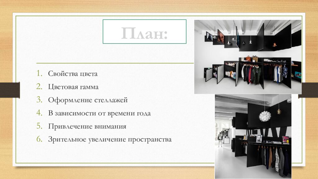 Свойства цвета Цветовая гамма Оформление стеллажей В зависимости от времени года Привлечение внимания Зрительное увеличение пространства План: